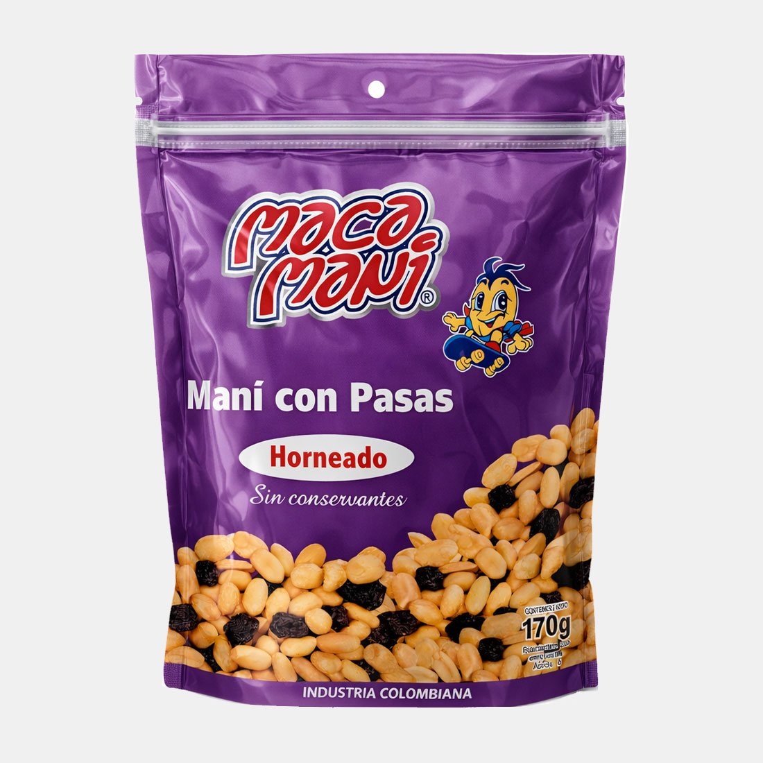 Mezcla equilibrada de maní horneado y pasas seleccionadas, ideal para snacks prácticos y nutritivos.